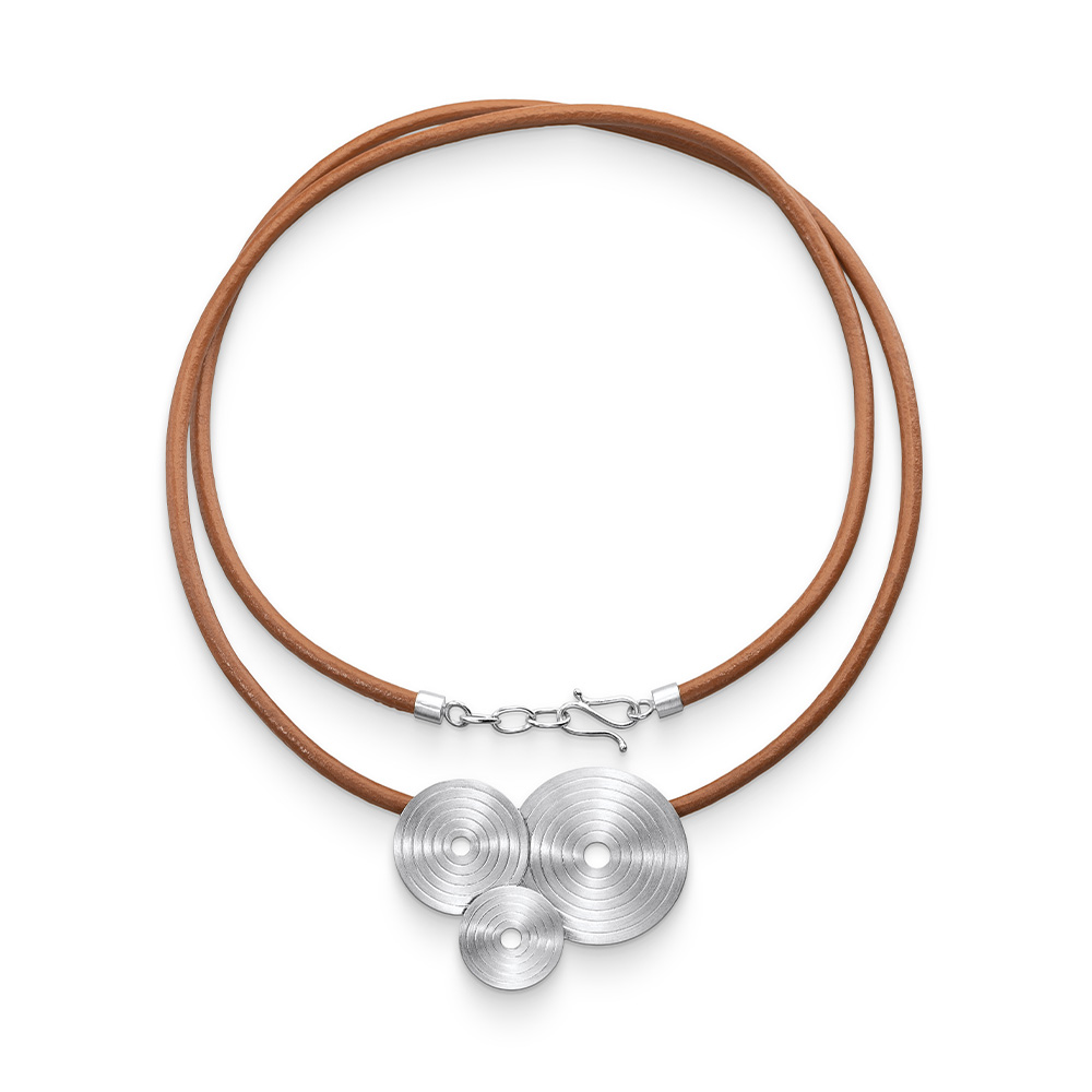 Colar Radial em prata com fio de couro, acabamento fosco. Pode ser usado em duas voltas ou como colar longo.